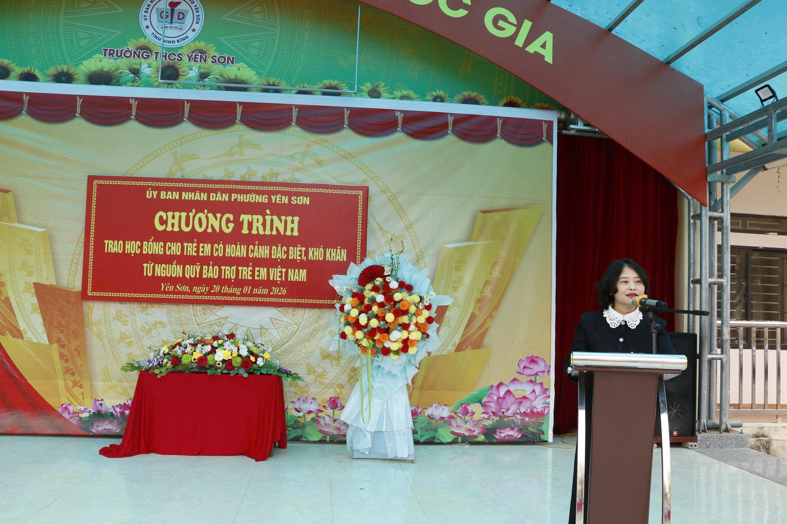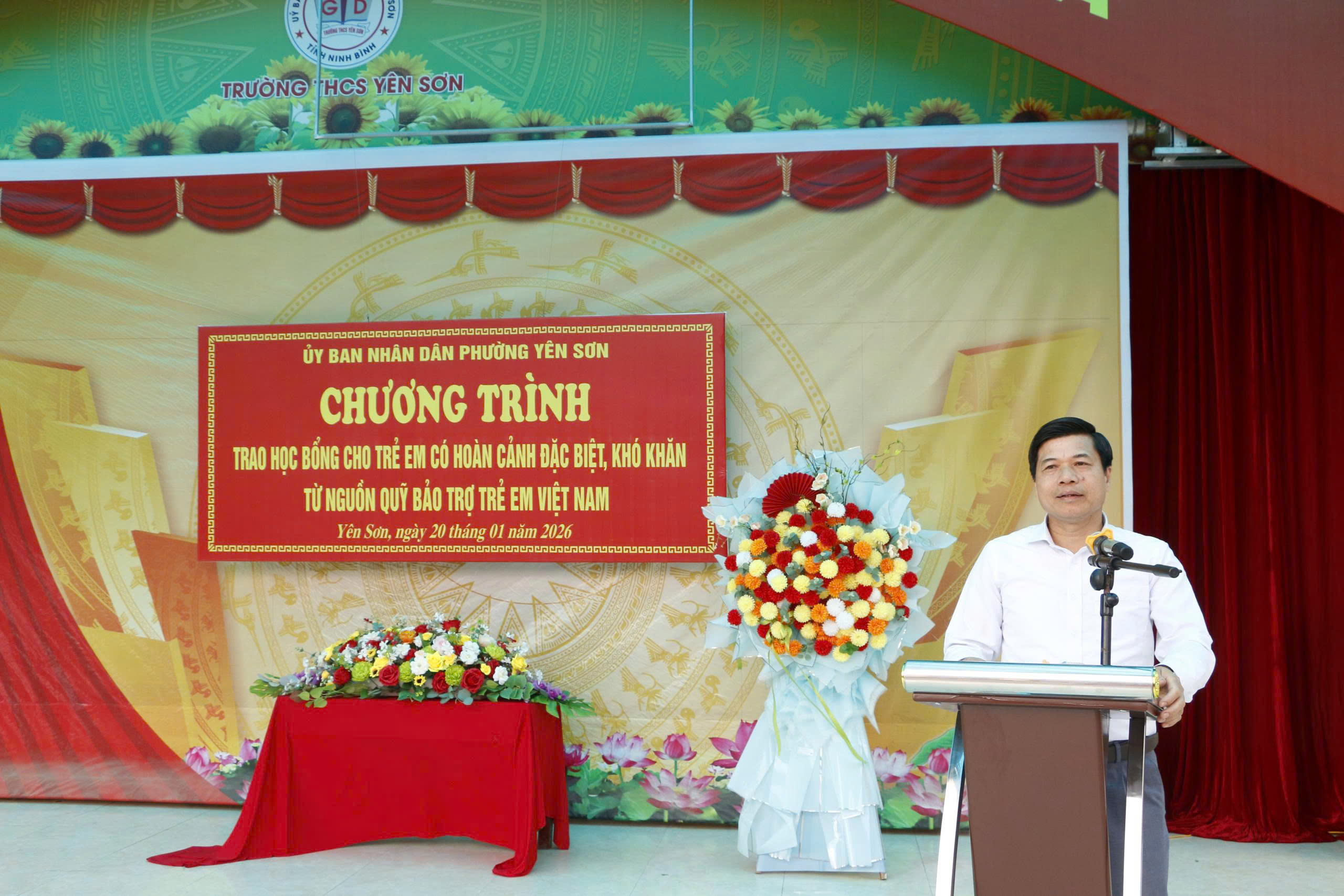 Ngày 20/01/2026, Chi cục Dân số và Trẻ em tỉnh Ninh Bình phối hợp với UBND phường Yên Sơn tổ chức chương trình trao học bổng cho 50 trẻ em có hoàn cảnh đặc biệt khó khăn trên địa bàn phường từ nguồn hỗ trợ của Quỹ Bảo trợ trẻ em Việt Nam.