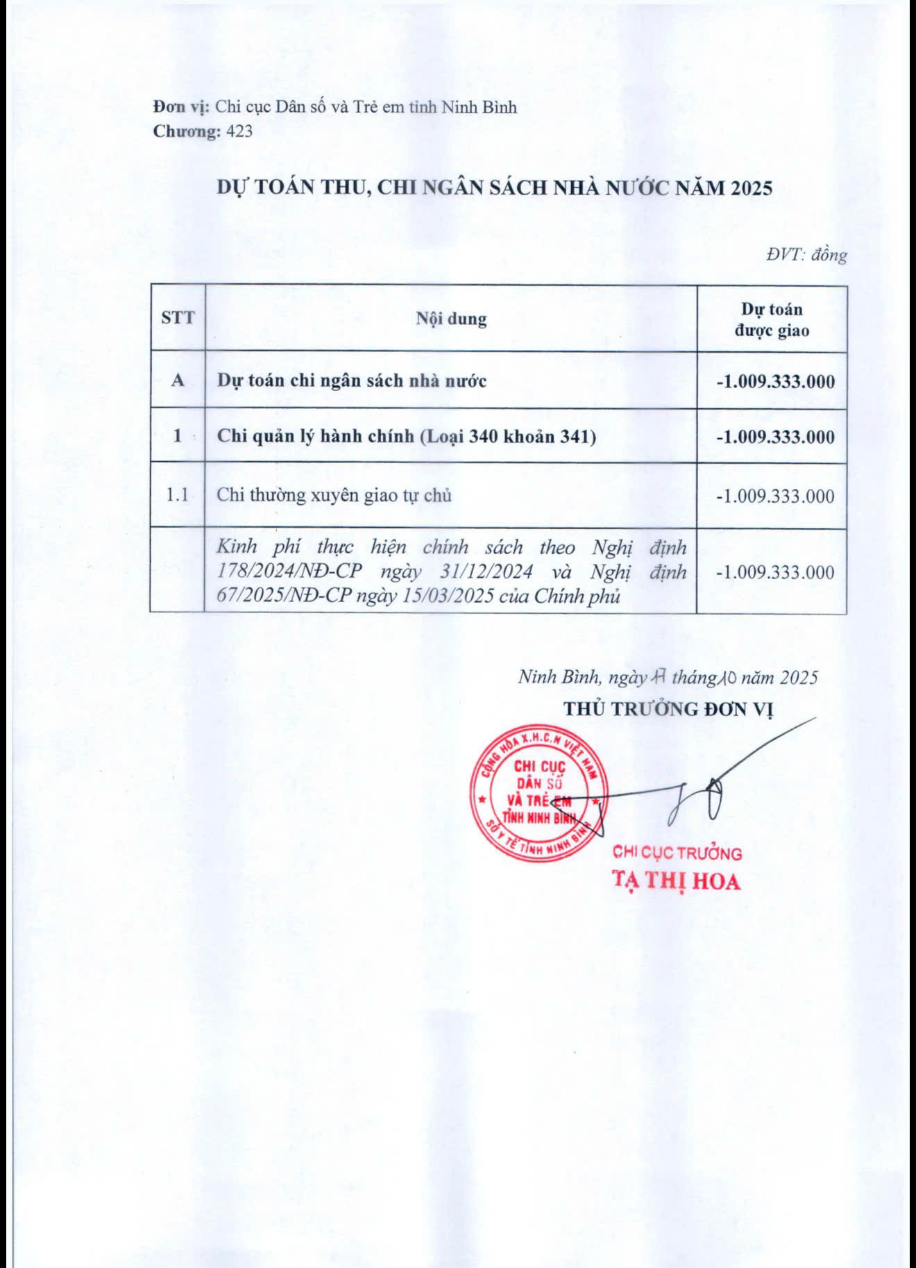 Công khai điều chỉnh giảm dự toán chi NSNN do thự hiện chế độ chính sách theo Nghị định 178 và Nghị định 67