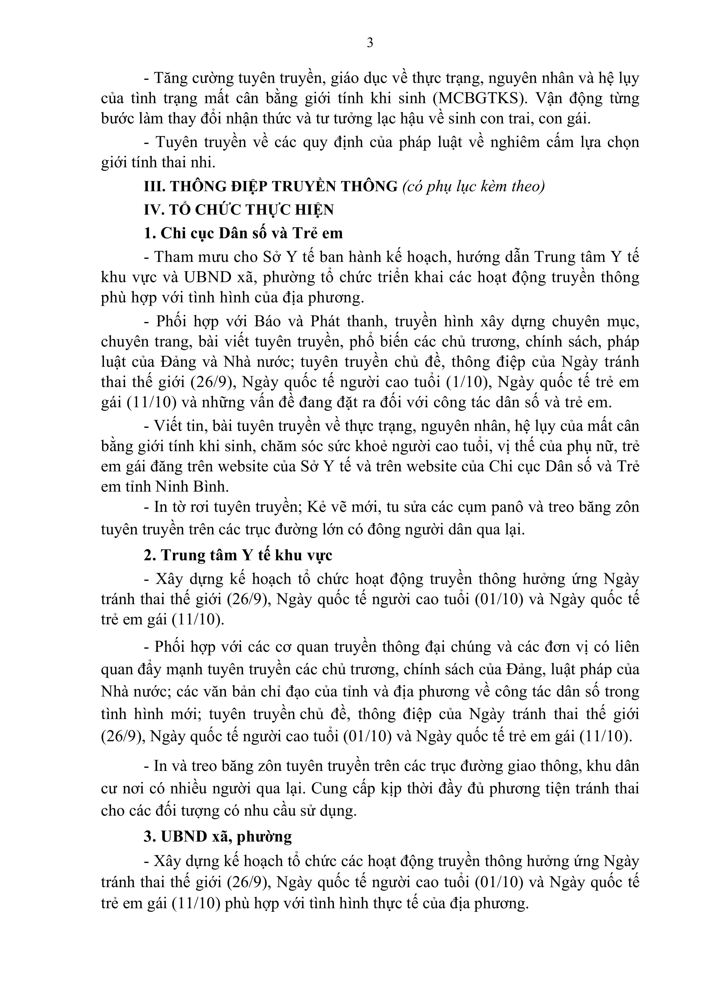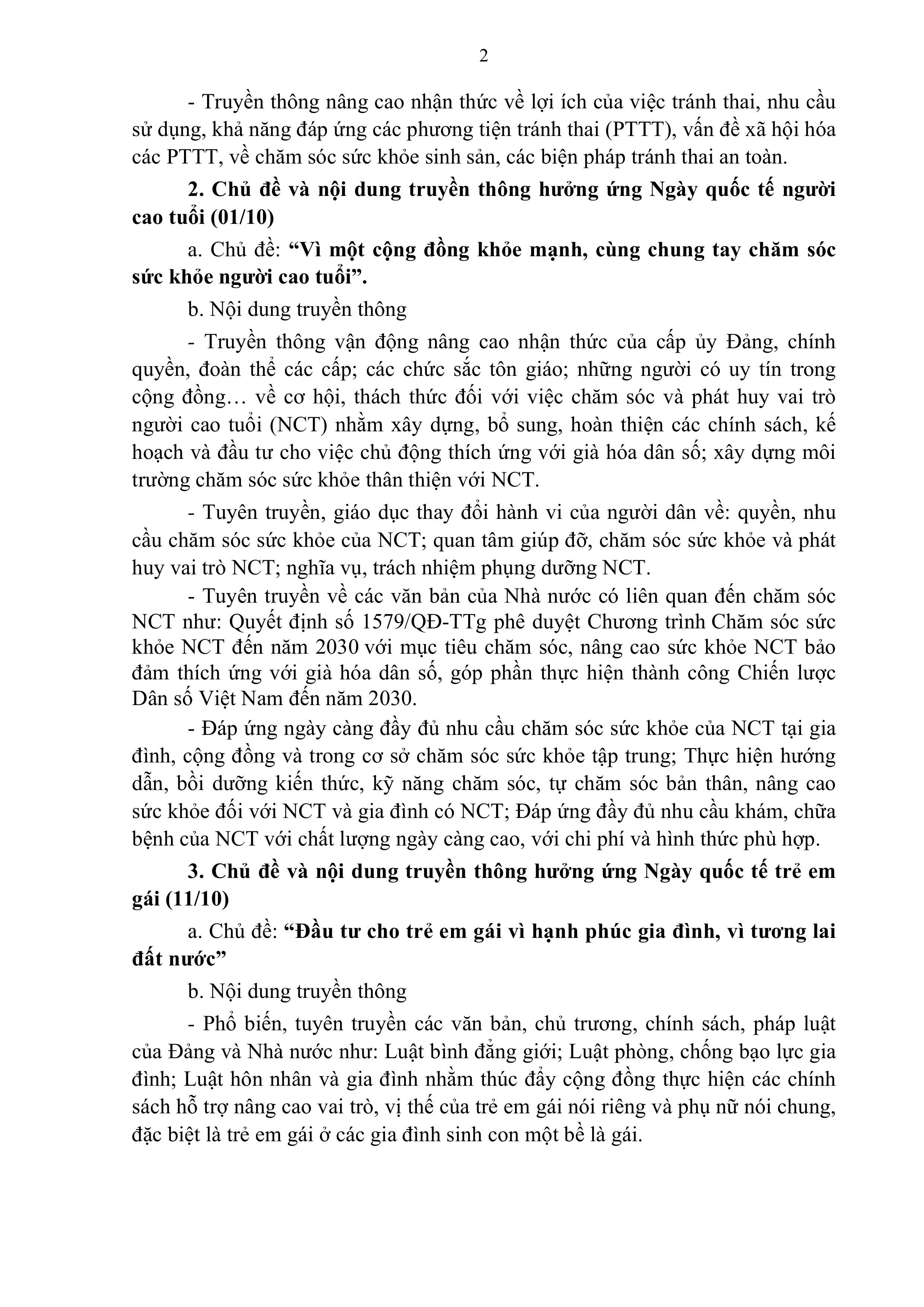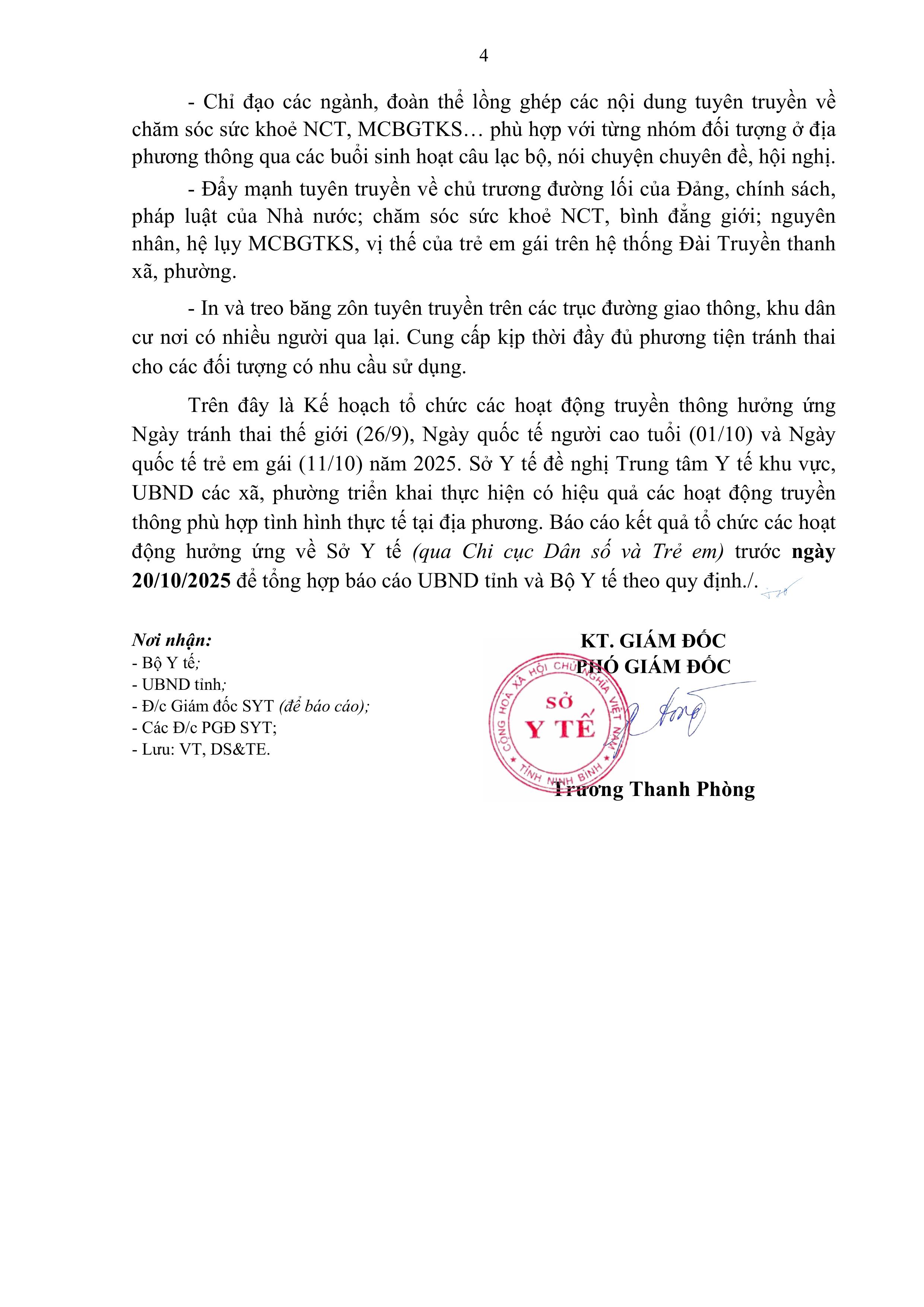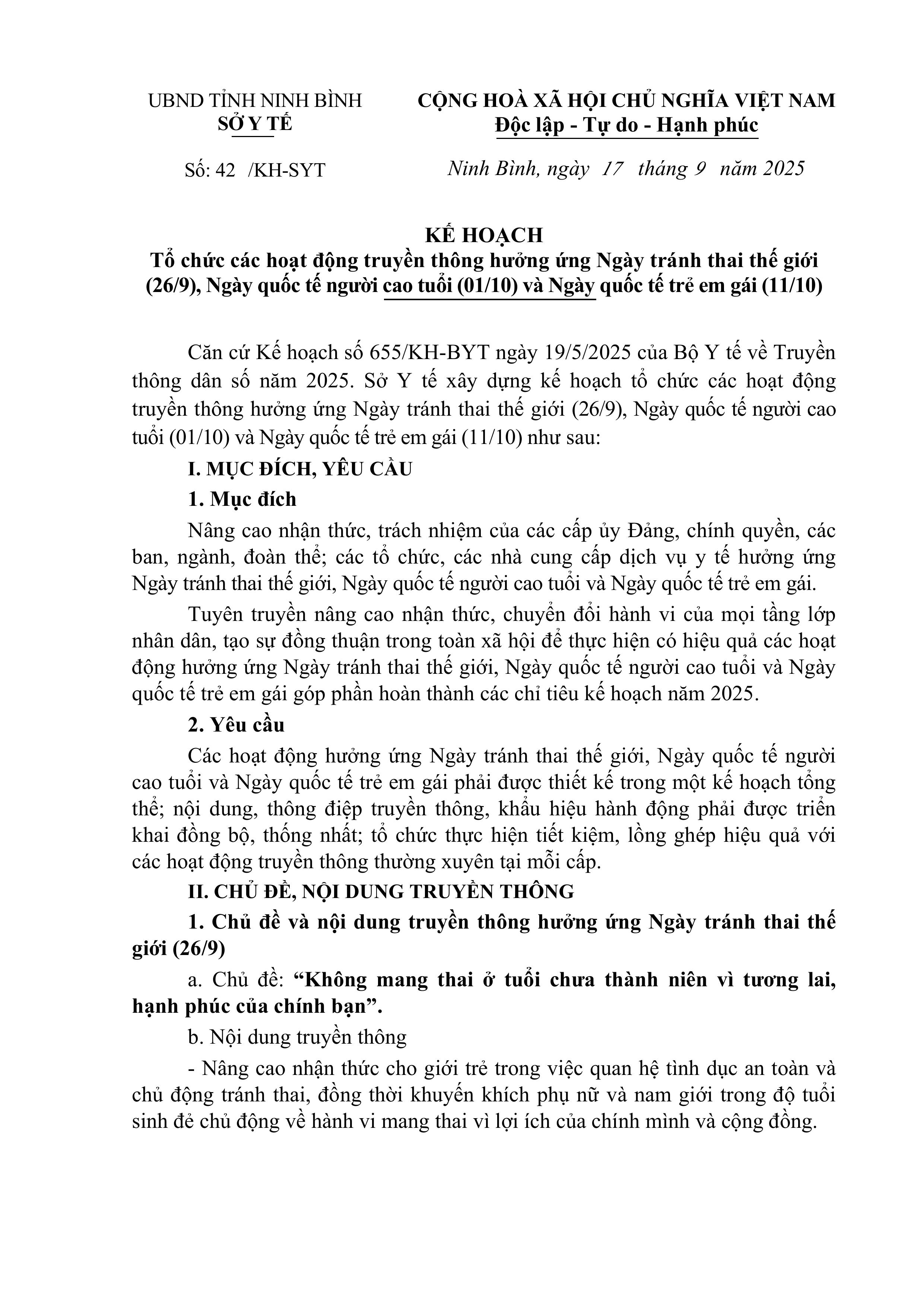 Kế hoạch tổ chức các hoạt động truyền thông hưởng ứng Ngày tránh thai thế giới (26/9), Ngày quốc tế người cao tuổi (01/10) và Ngày quốc tế trẻ em gái (11/10)