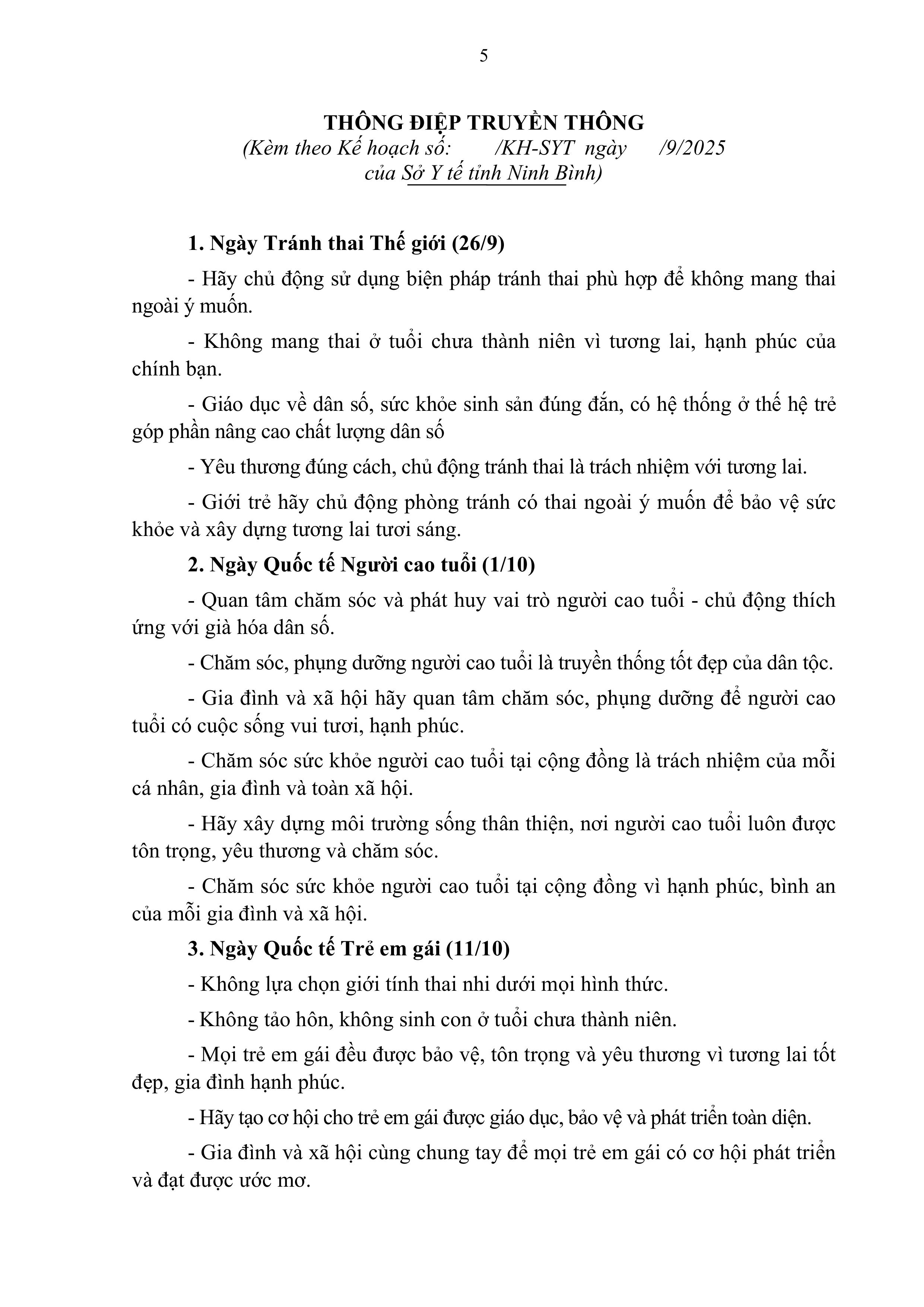 Kế hoạch tổ chức các hoạt động truyền thông hưởng ứng Ngày tránh thai thế giới (26/9), Ngày quốc tế người cao tuổi (01/10) và Ngày quốc tế trẻ em gái (11/10)