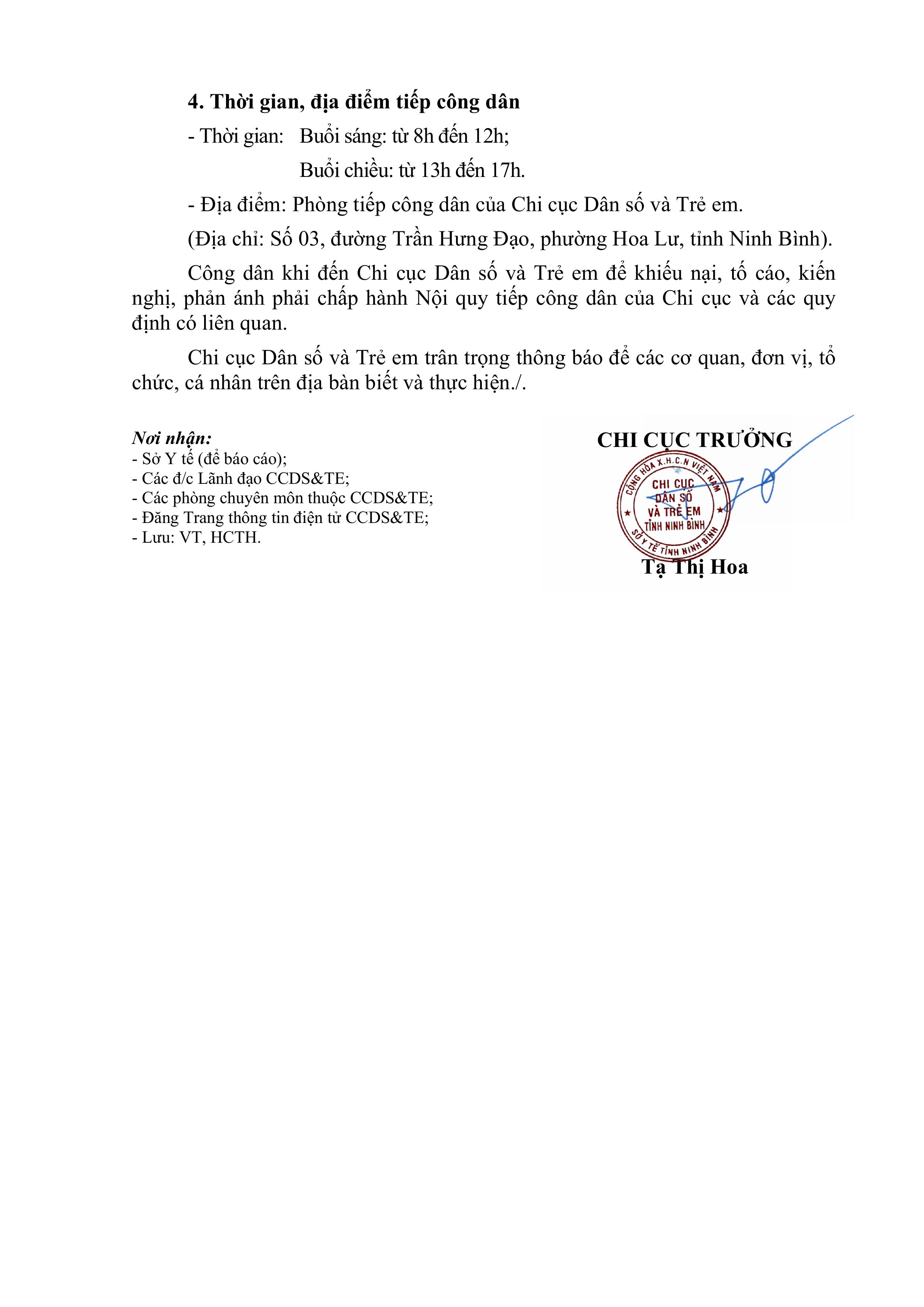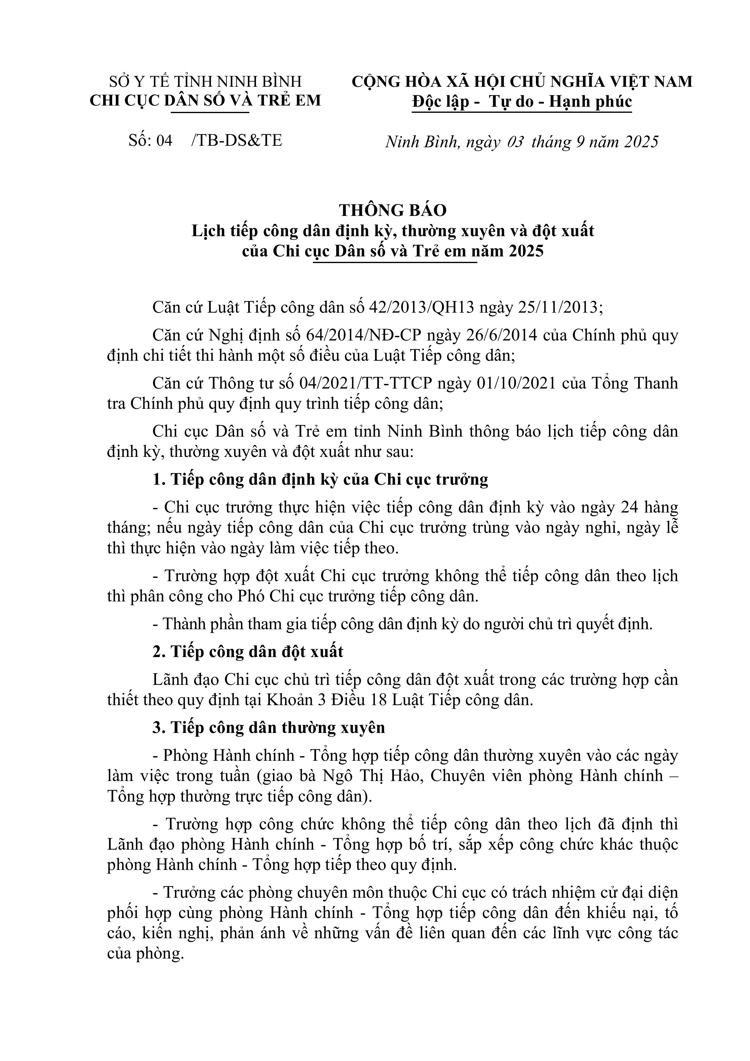 Lịch tiếp công dân định kỳ, thường xuyên và đột xuất của Chi cục Dân số và Trẻ em năm 2025