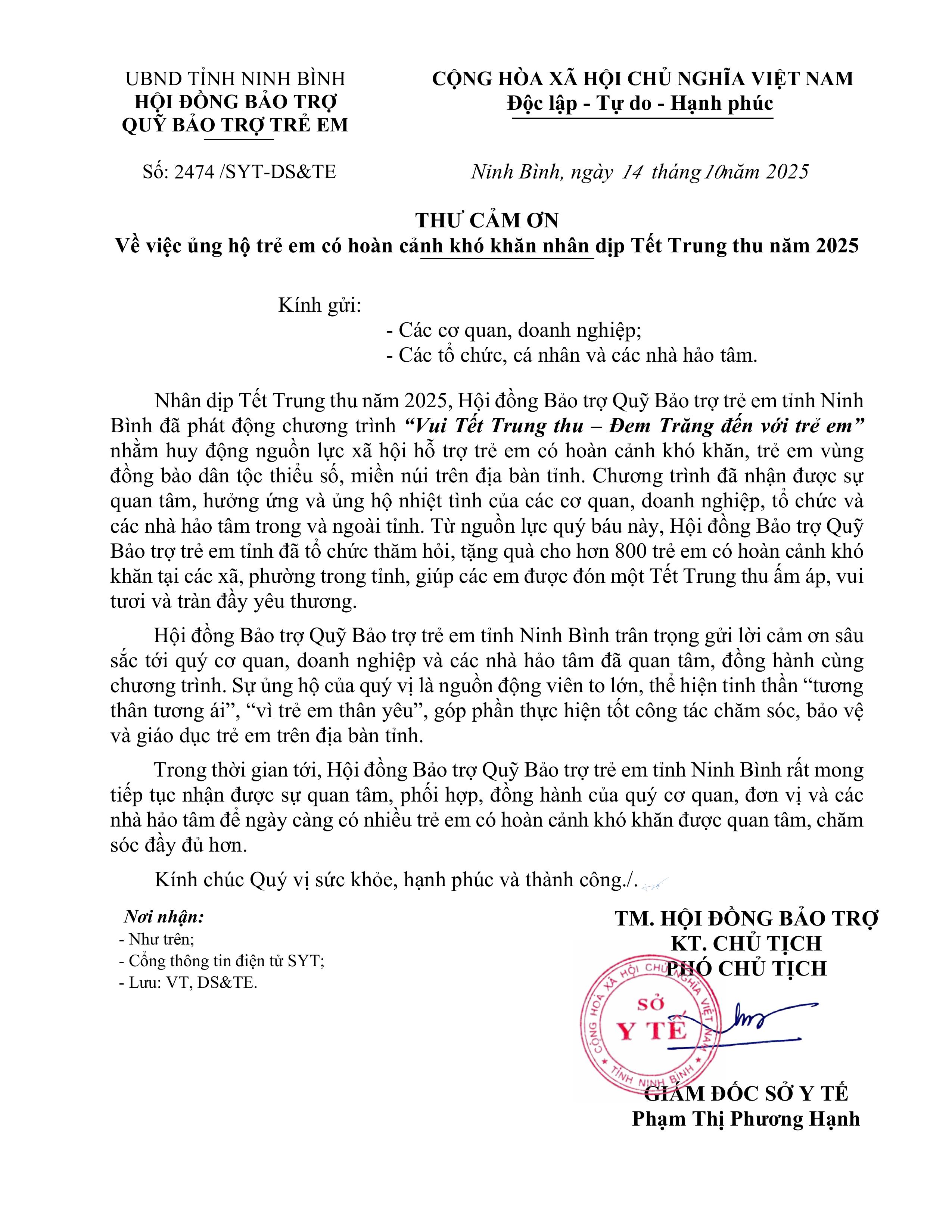 Thư cảm ơn về việc ủng hộ trẻ em có hoàn cảnh khó khăn nhân dịp Tết Trung thu năm 2025