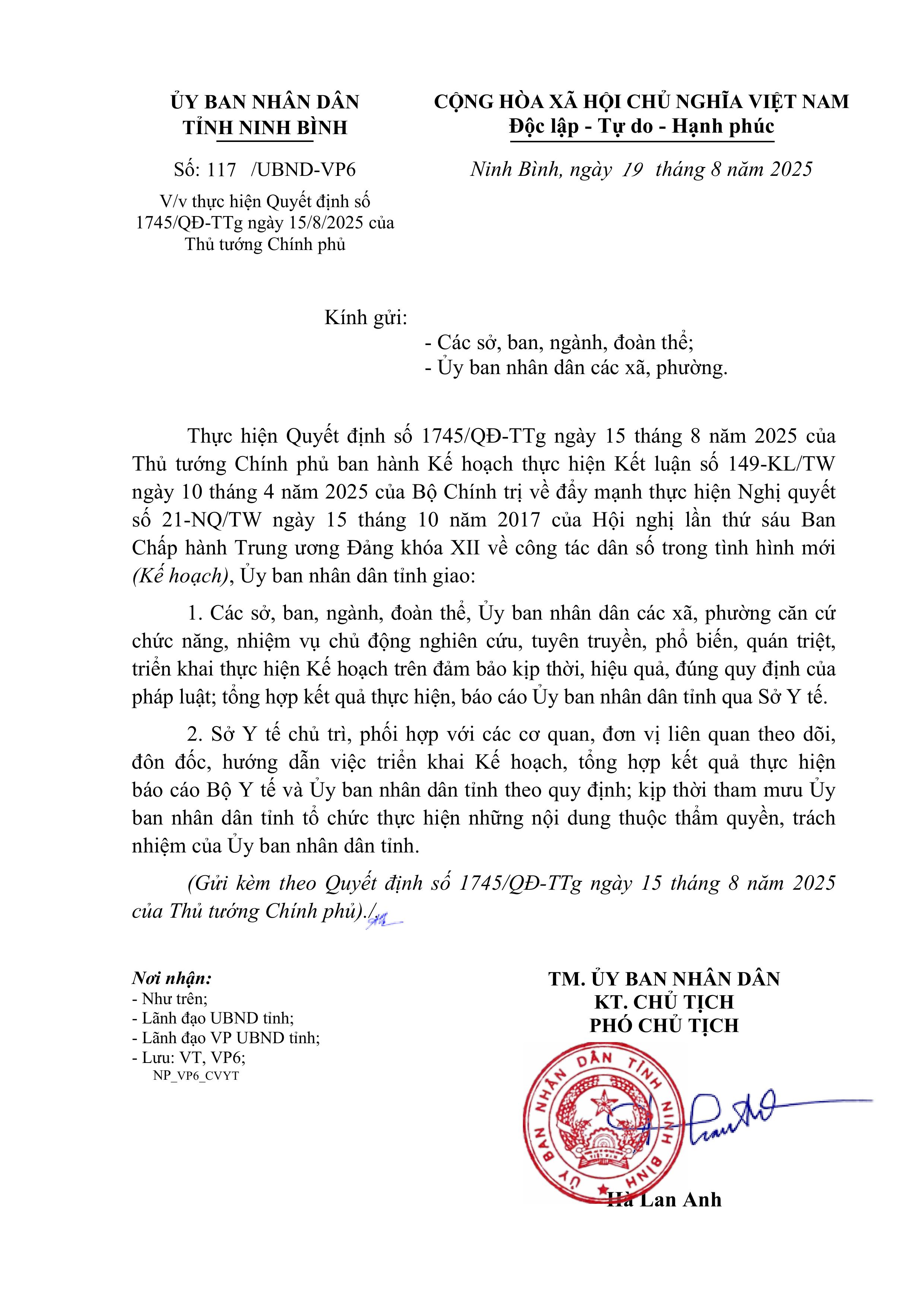 Thực hiện Quyết định số 1745/QĐ-TTg ngày 15 tháng 8 năm 2025 của Thủ tướng Chính phủ ban hành Kế hoạch thực hiện Kết luận số 149-KL/TW ngày 10 tháng 4 năm 2025 của Bộ Chính trị về đẩy mạnh thực hiện Nghị quyết số 21-NQ/TW ngày 15 tháng 10 năm 2017 của Hội nghị lần thứ sáu Ban Chấp hành Trung ương Đảng khóa XII về công tác dân số trong tình hình mới