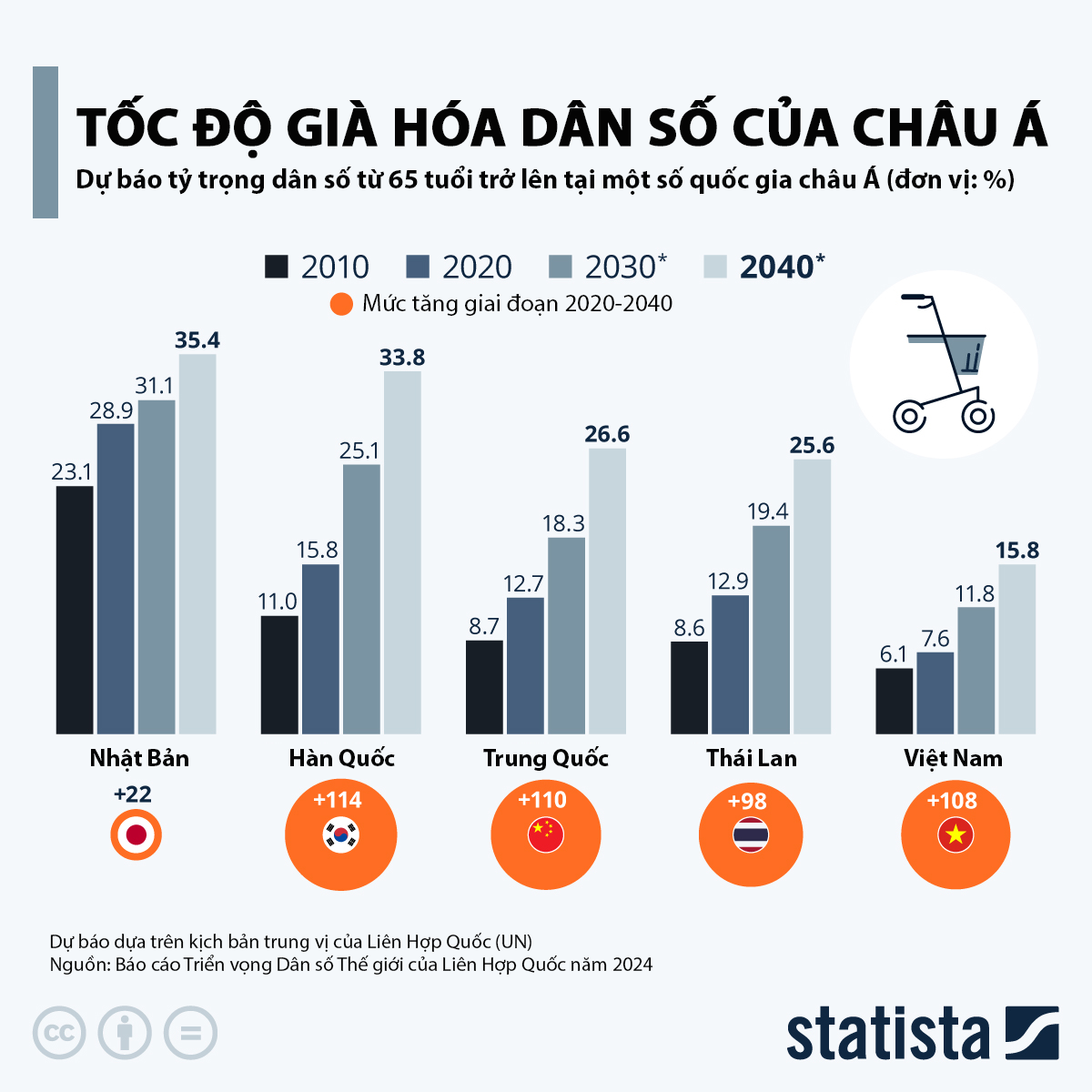 Không chỉ các nước Đông Á, nhiều quốc gia Đông Nam Á cũng đang tiến nhanh vào giai đoạn già hóa dân số. Thái Lan được dự báo sẽ có 25,6% dân số từ 65 tuổi trở lên vào năm 2040, trong khi Việt Nam dự kiến đạt 15,8%, tăng mạnh so với hiện nay. Đáng chú ý, Việt Nam là một trong những quốc gia có thời gian chuyển từ “già hóa” sang “dân số già” ngắn, cho thấy tốc độ thay đổi cơ cấu dân số rất nhanh.